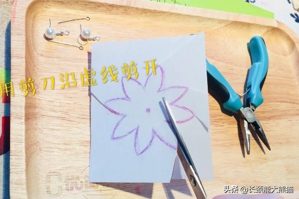 如何自制耳环|DIY自制耳环架?1、用彩铅在白色热缩片材料上画出所需要的形状,热缩片加热后会缩小大概三分之二,所以画的时候要画的大一点。